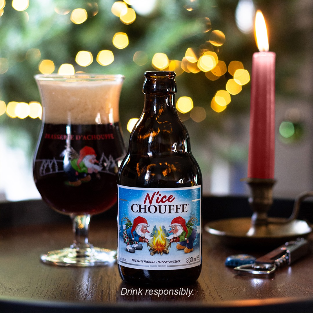 La N'ice CHOUFFE est la bière d’hiver de la brasserie d'Achouffe. Nous vous conseillons de la déguster de mi-octobre à mi-février, de préférence au coin du feu . C’est une bière brune, légèrement houblonnée, épicée au thym et au curaçao, fabriquée à partir d’écorces d’orange. Elle atteint les 10° alc./vol. La N’ice CHOUFFE accompagne très bien tous les plats d’hiver.