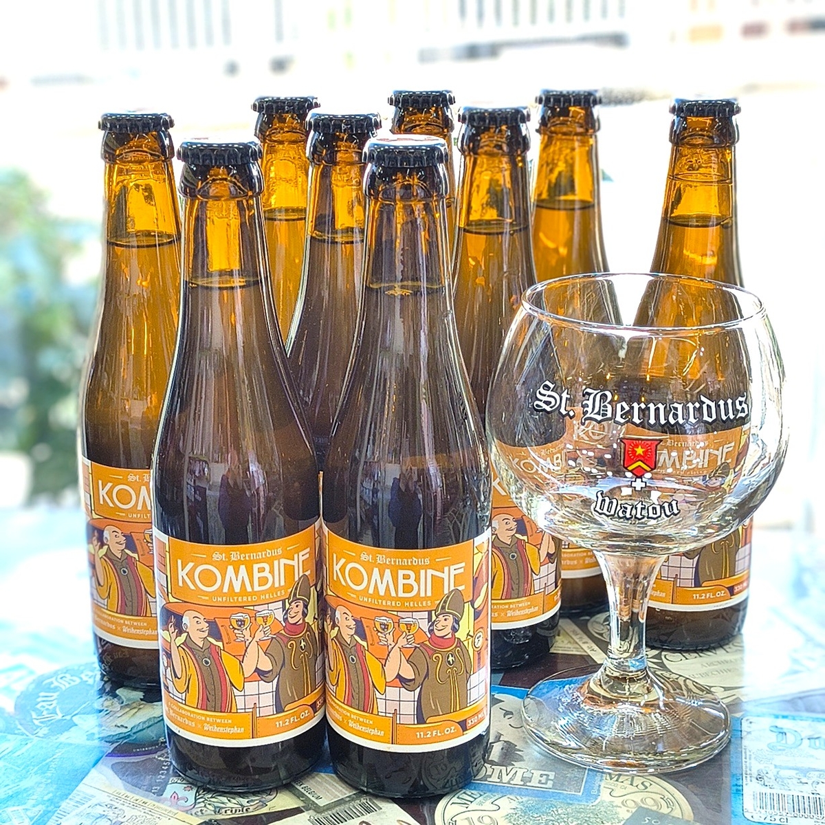 The visual identity of Kombine 2025 continues the design introduced with Braupakt. The label once again features St. Bernardus and Saint Korbinian, the founder of Weihenstephan. These two iconic figures were brought to life by the Belgian illustrator Xavier Truant, who also created the now-famous illustrations for the elevator shaft in our brewery in Watou.