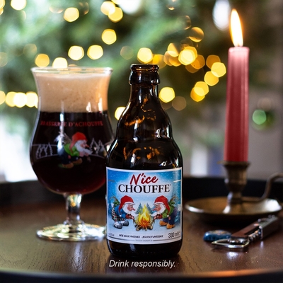 La N'ice CHOUFFE est la bière d’hiver de la brasserie d'Achouffe. Nous vous conseillons de la déguster de mi-octobre à mi-février, de préférence au coin du feu . C’est une bière brune, légèrement houblonnée, épicée au thym et au curaçao, fabriquée à partir d’écorces d’orange. Elle atteint les 10° alc./vol. La N’ice CHOUFFE accompagne très bien tous les plats d’hiver.